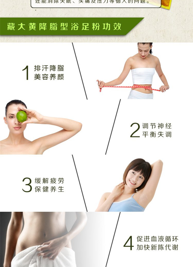 本品選用藏大黃、生山楂、澤瀉、丹參、決明子、荷葉等天然中草藥按照“君臣佐使”的配方原則科學配方,經超微粉碎精制而成。使用本品泡腳通過熱效滲透和藥物的作用,起到擴張毛孔、打開穴位、促進經絡氣血循環、調節神經,緩解疲勞,補充身體所需的營養物質,經常使用能起到降脂減肥的作用。 This Chinese medicine be used for foot bath or foot steaming saunna to reduce the weight for body slim and beauty.